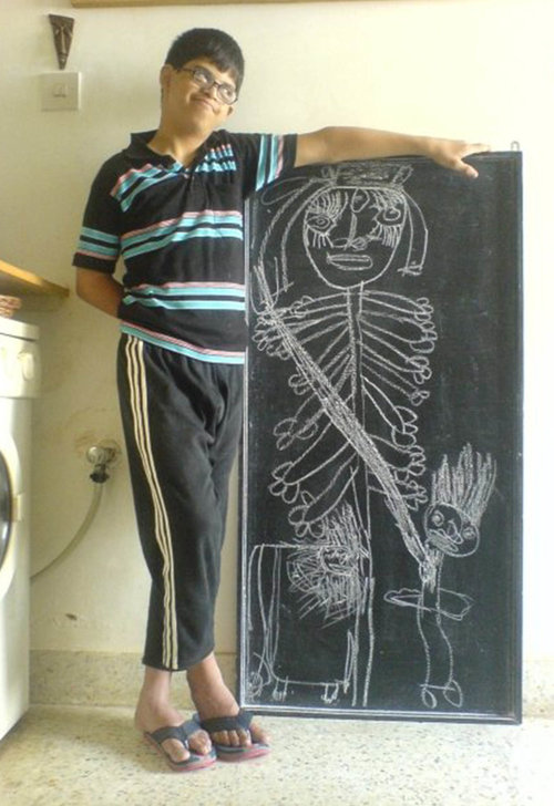He may have been a slow learner when it came to cognitive skills due to this condition, but ever since he learnt how to hold a pencil/chalk he started doing what he loves.