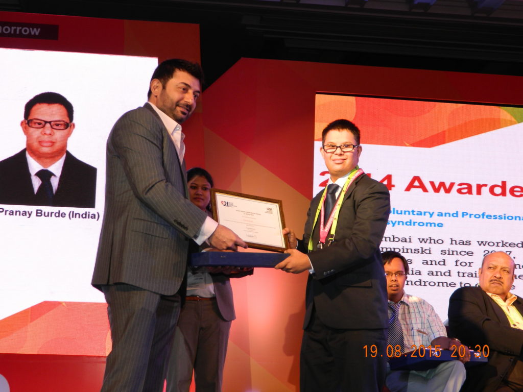 • Pranay was invited by the Scientific Committee of 12th World Down Syndrome Congress 2015 to deliver keynote address and participate in the congress for all four days from 18 to 21 August 2015. Pranay delivered keynote address on “Capacity Building of Persons with Intellectual Disabilities” at World Down Syndrome Congress 2015 on 20th Aug 2015 where over 600 dignitaries from 42 countries were present. He also received World Down Syndrome Day 2014 Award at the congress on 19th Aug 2015. He got this award for advocating for his rights and for his advocacy for inclusion of Persons with Intellectual and Developmental Disabilities in society and imparting training to other persons with Down Syndrome to do the same.