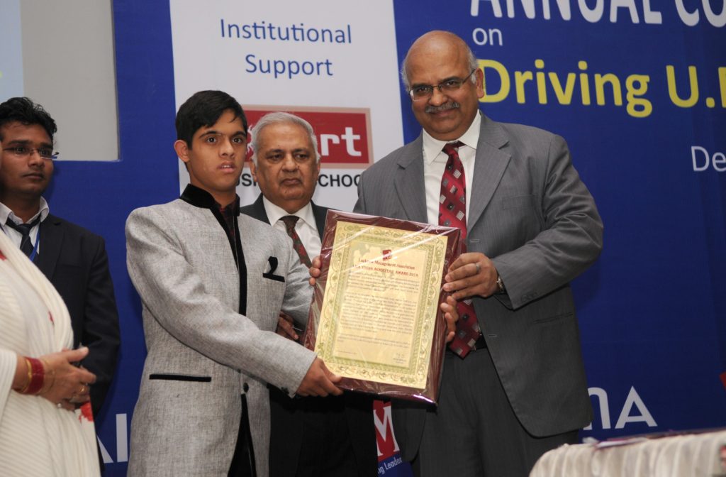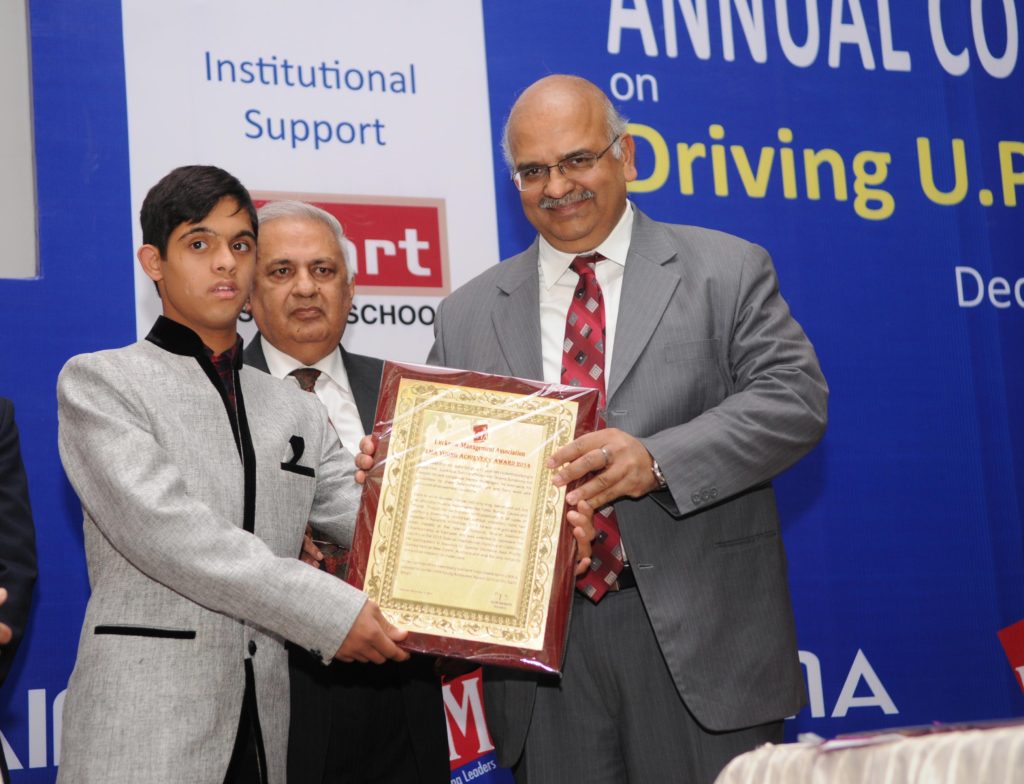 In recognition of his bold and indomitable spirit, he has been awarded LMA Young Achiever’s Award in 2014 by Lucknow Management association (LMA). On the World Disability day, 3rd December 2014, he was felicitated and conferred State Award for the ‘Outstanding Role Model’ in Mental Disability category by Government of U.P. for his extraordinary and exemplary accomplishments among children with intellectual disabilities. This was the first time when an intellectually disabled person received both these awards.